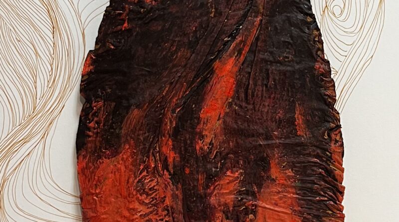 is a never-ending process. Repairing our garment extends to repairing our bodies, our relationships and our world – Tikkun Olam as it translates to repair the world in the Hebrew language. Mollie Conlee work inspired by quilts that bring comfort and rest to mind. With comfort, we hope for a way out of despair and healing. The work by Fernando Mondragón suggests that there is hope. Then the works of Carol Eason and Laura Petrovich-Cheney give us a glimpse into the restorative power of creating art. Carol’s red dress was created with a Saori weaving method, a Japanese freestyle weaving approach where imperfections are accepted. Laura repurposed materials in her work, offering us the opportunity to imaging survival of materials, especially fabric, in artwork.